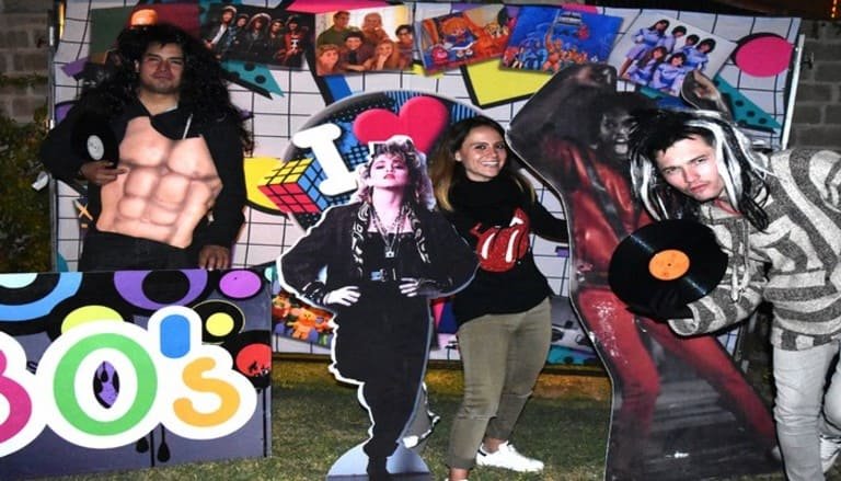 Una opción es contar con un espacio que puedas llenar con posters de cantantes, grupos y diversos artistas de la época, así mismo puedes anexar pancartas con frases como «amamos los 80’s», de igual forma puedes crear un mural con frases características de la época, y algunos espacios para que los invitados puedan dejar su propio mensaje, esto no solo rememorará esos años, sino también será un atractivo espacio para las amantes de las fotos y selfies, de seguro tus invitados quedaran fascinados.