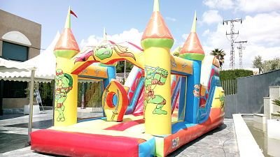 Ninja: Se trata de un hinchable de 9x5x4,5. Tiene una gran zona de salto con zona de obstáculos, y tobogán. Gracias a sus medidas, es ideal para niñ@s de todas las edades.