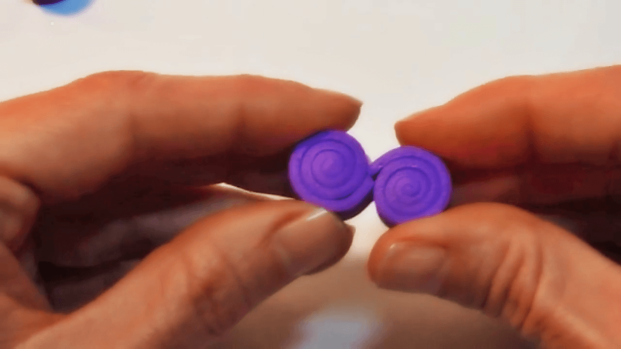 Ahora hay que enrollar las tres tiras lilas de 9cm para hacer el cuerpo de la mariposa. Una vez tenemos los tres rollitos, tenemos que pegarlos los unos a los otros con silicona.
