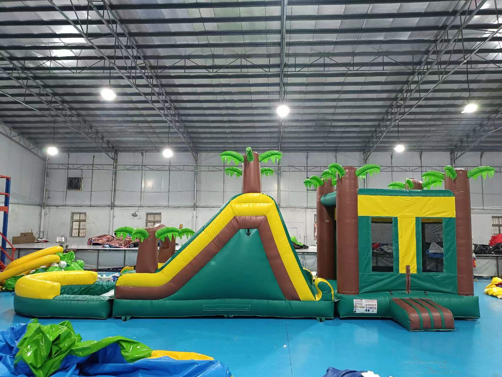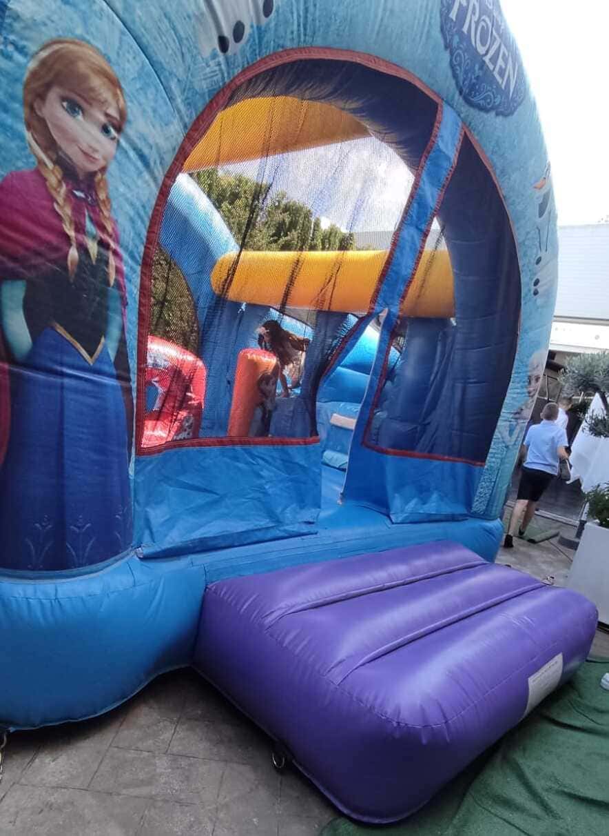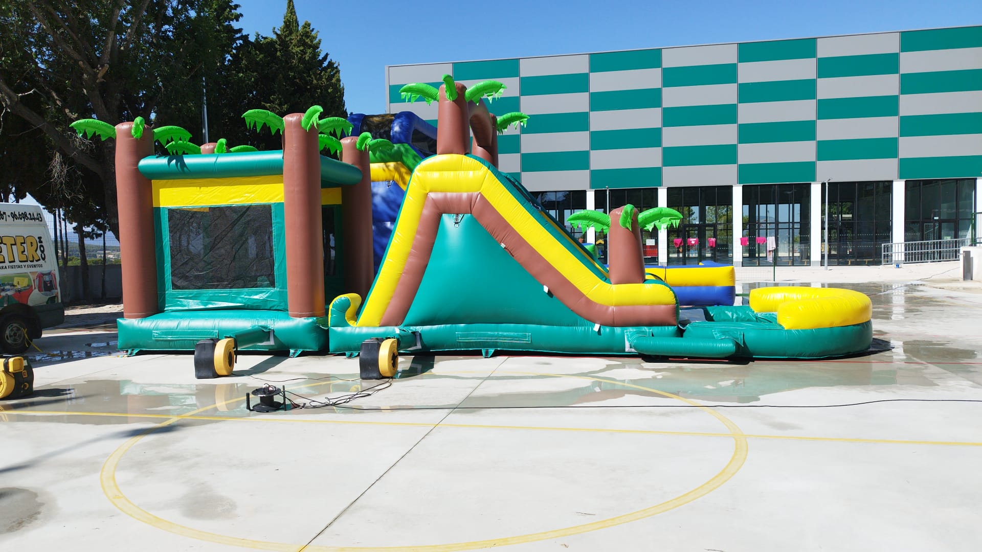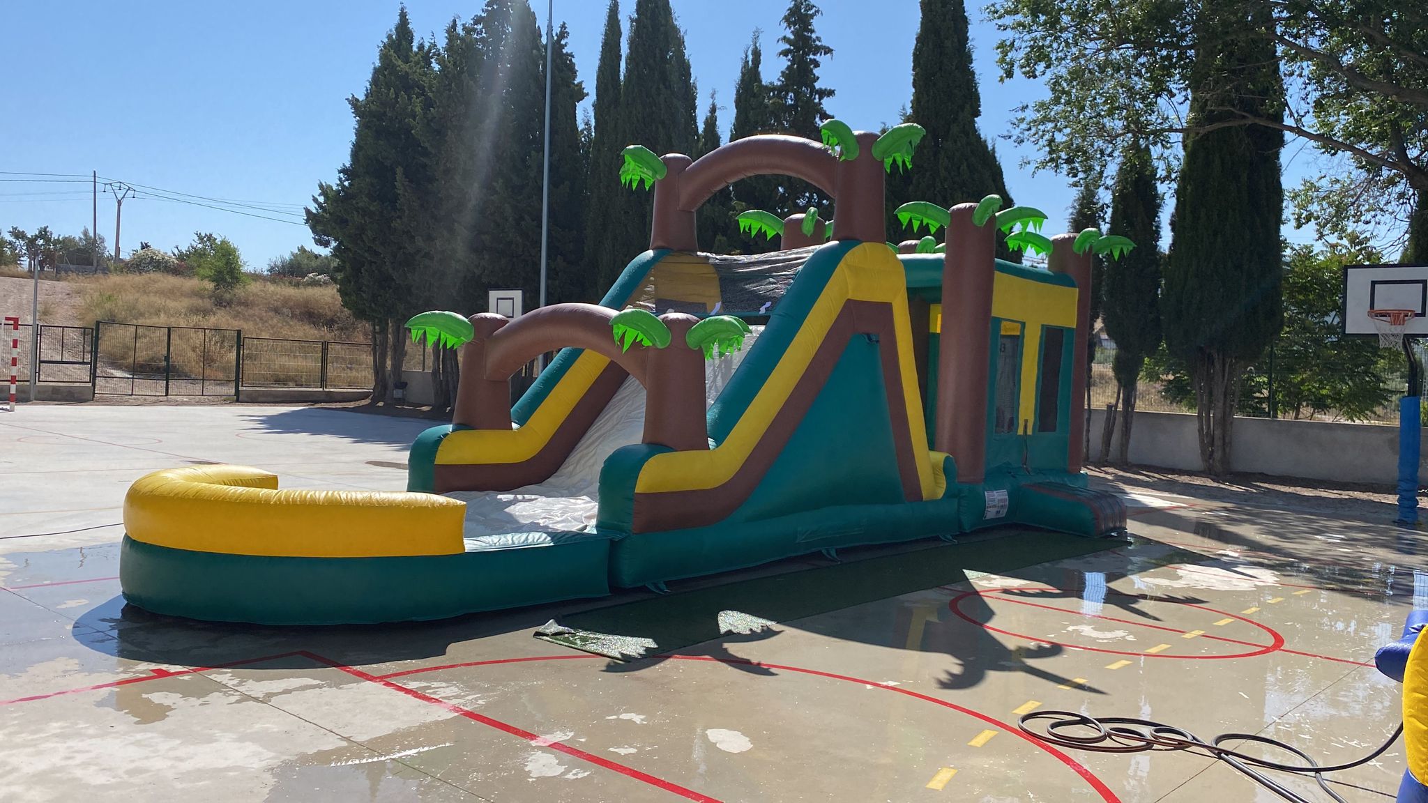 - Colchoneta con tobogán, tiene zona de salto con obstáculos y toldo